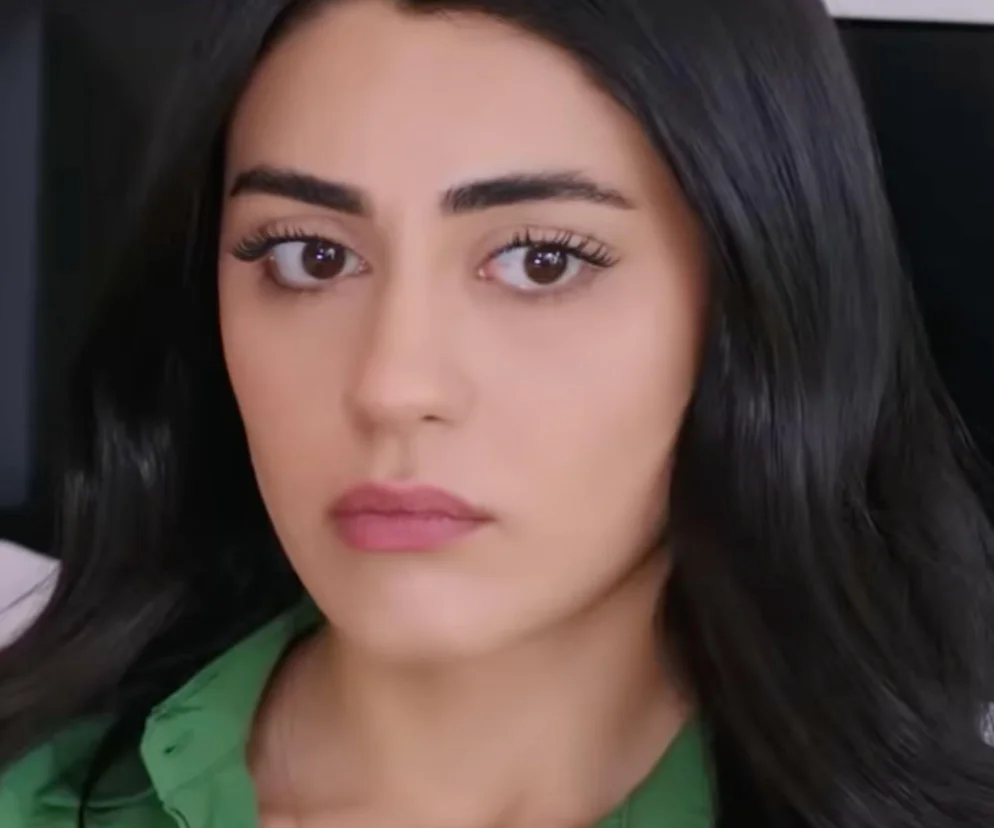 Zmartwiona Hancer, główna bohaterka serialu Panna młoda, ubrana w zieloną koszulę, z ciemnymi włosami i brązowymi oczami, spogląda w obiektyw, symbolizując niepokój związany z ciążą Beyzy. Więcej o losach postaci na Super Seriale.