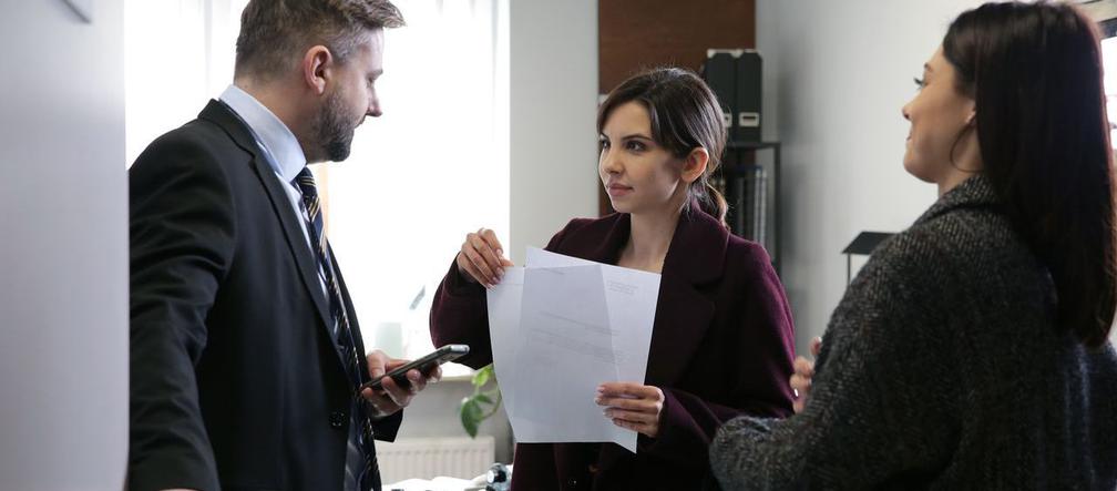 - I właśnie dlatego bardzo proszę o rozpatrzenie naszego wniosku. Oczywiście pozytywnie - Kryńska w 1514 odcinku "M jak miłość" wręczy urzędnikowi dokumenty.