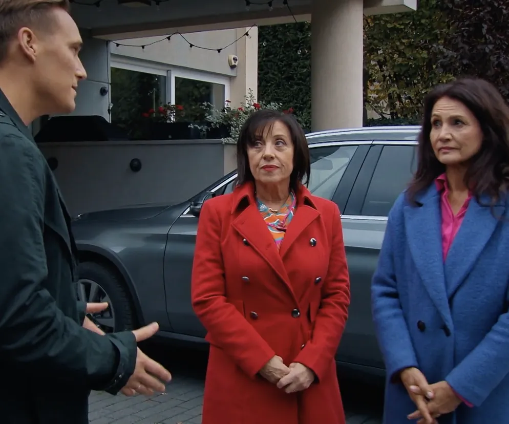 - Jak pani nie wstyd?! Żeby rodzinę rozbijać! Dziecku ojca kraść! - nawrzeszczą na Stawską Aleksandra i Iwona, a ona z przerażeniem cofnie się w głąb domu. Olek natychmiast podniesie się z krzesła i z wielkim zdziwieniem przyjrzy się seniorkom. - Mamo, Iwona, a co wy tu robicie? - ostro zdziwi się zdezorientowany Olek, kiedy ujrzy obie kobiety. - A co ty tu robisz? - wrzasną na niego oskarżycielskim tonem. Dopiero po chwili wyjaśni się, że Kasia to ukochana Karskiego, a Chodakowski wyprowadzi obie kobiety na zewnątrz i zacznie się niezła reprymenda.