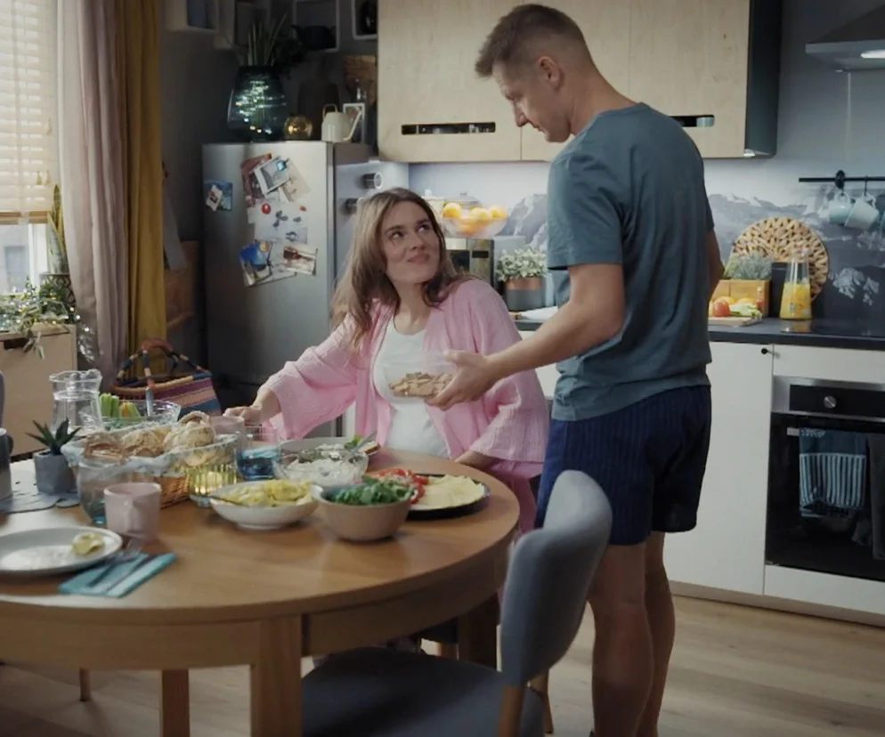 W trakcie śniadania Paweł z dużym zainteresowaniem zaobserwuje miksy smakowe ciężarnej żony.