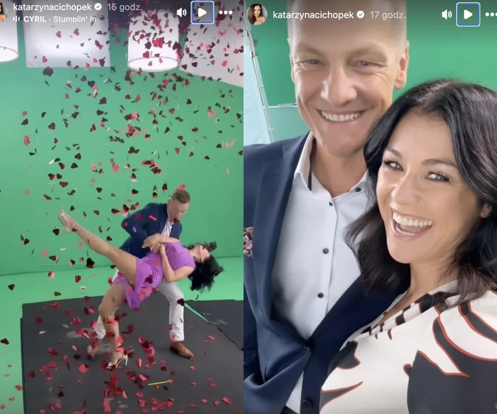 - Kochani, jak wam się podoba nowa wersja Kingi Zduńskiej? Mam nadzieję, że bardzo - relacjonuje wystrojona Katarzyna Cichopek z planu kręcenia czołówki. - Słuchajcie, jesteśmy na planie nowej czołówki serialu "M jak miłość". Moja postać po chyba dziesięciu latach nagrywa nową czołówkę! Tak że kochani, nie może was zabraknąć przed telewizorami we wrześniu, kiedy startujemy z nowym sezonem. Zobaczcie jak pięknie wygląda mój małżonek - uśmiecha się aktorka, pokazując serialowego Piotrka.