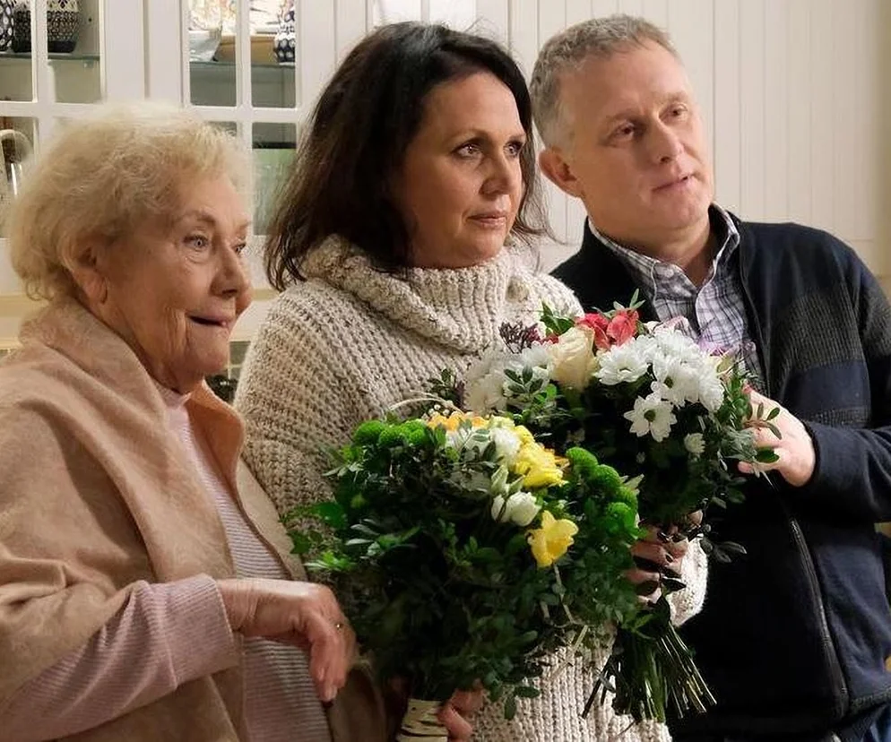 Teresa Lipowska (Barbara) i Witold Pyrkosz (Lucjan) z wnukiem Mateuszem (Krystian Domagała) na planie M jak miłość w lutym 2002 roku
