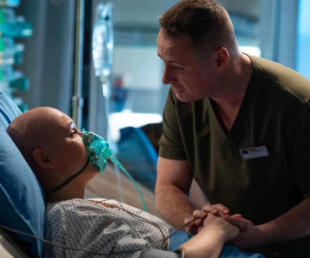 Autor: Artrama/ Materiały prasowe Iga (Anna Szymańczyk) z ogoloną głową i maską tlenową leży w szpitalnym łóżku. Przy niej czuwa Aleś (Paweł Małaszyński), trzymając ją za rękę i pocieszając po operacji mózgu i afazji. Więcej o ich losach na "Super Seriale".