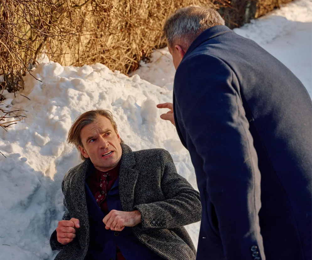 Autor: Warner Bros. Discovery/ TVN/ Materiały prasowe x-news Mariusz Czerski, ubrany w płaszcz i marynarkę, siedzi na śniegu z wyrazem złości i desperacji, podczas gdy drugi mężczyzna, stojący tyłem, wymachuje do niego ręką. Scena bójki na cmentarzu z serialu "Na Wspólnej" w nowym odcinku, dostępna na stronie Super Seriale.